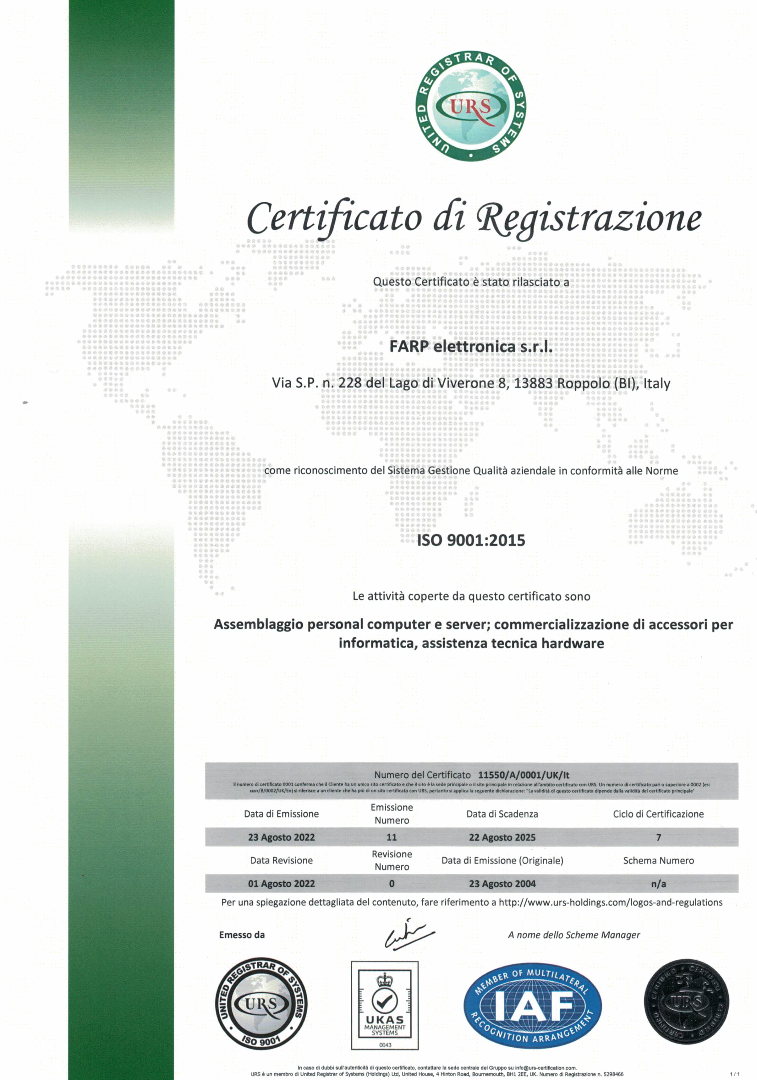 FARP Elettronica Srl è certificata UNI EN ISO 9001:2015: lo standard di riferimento internazionale per la gestione della qualità.